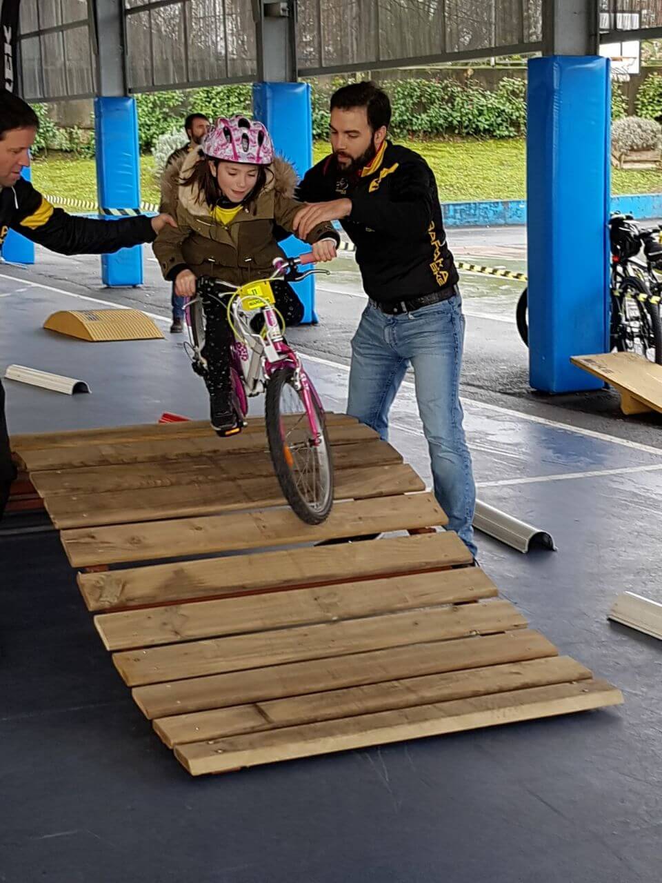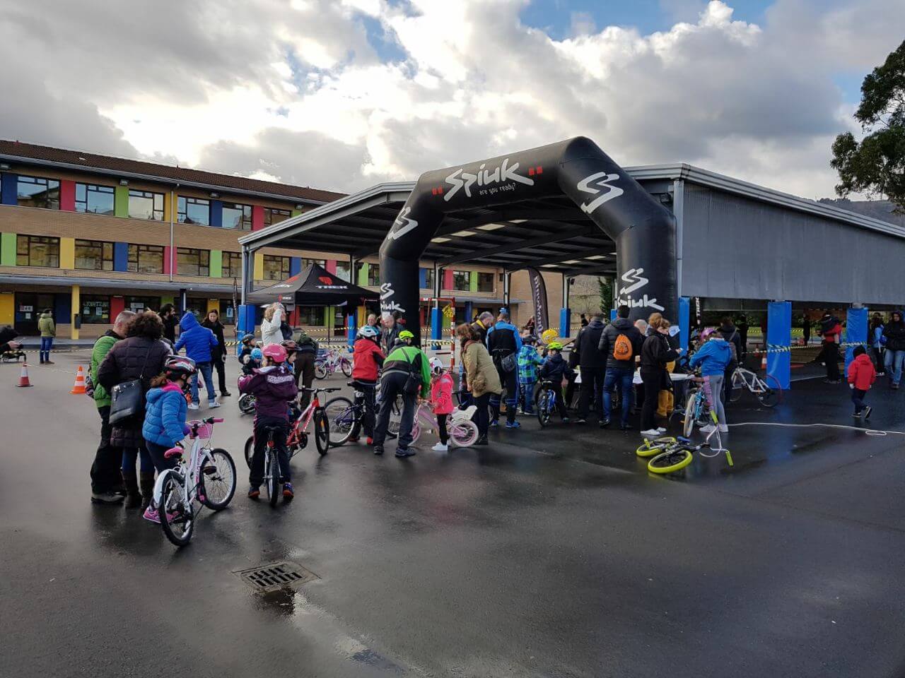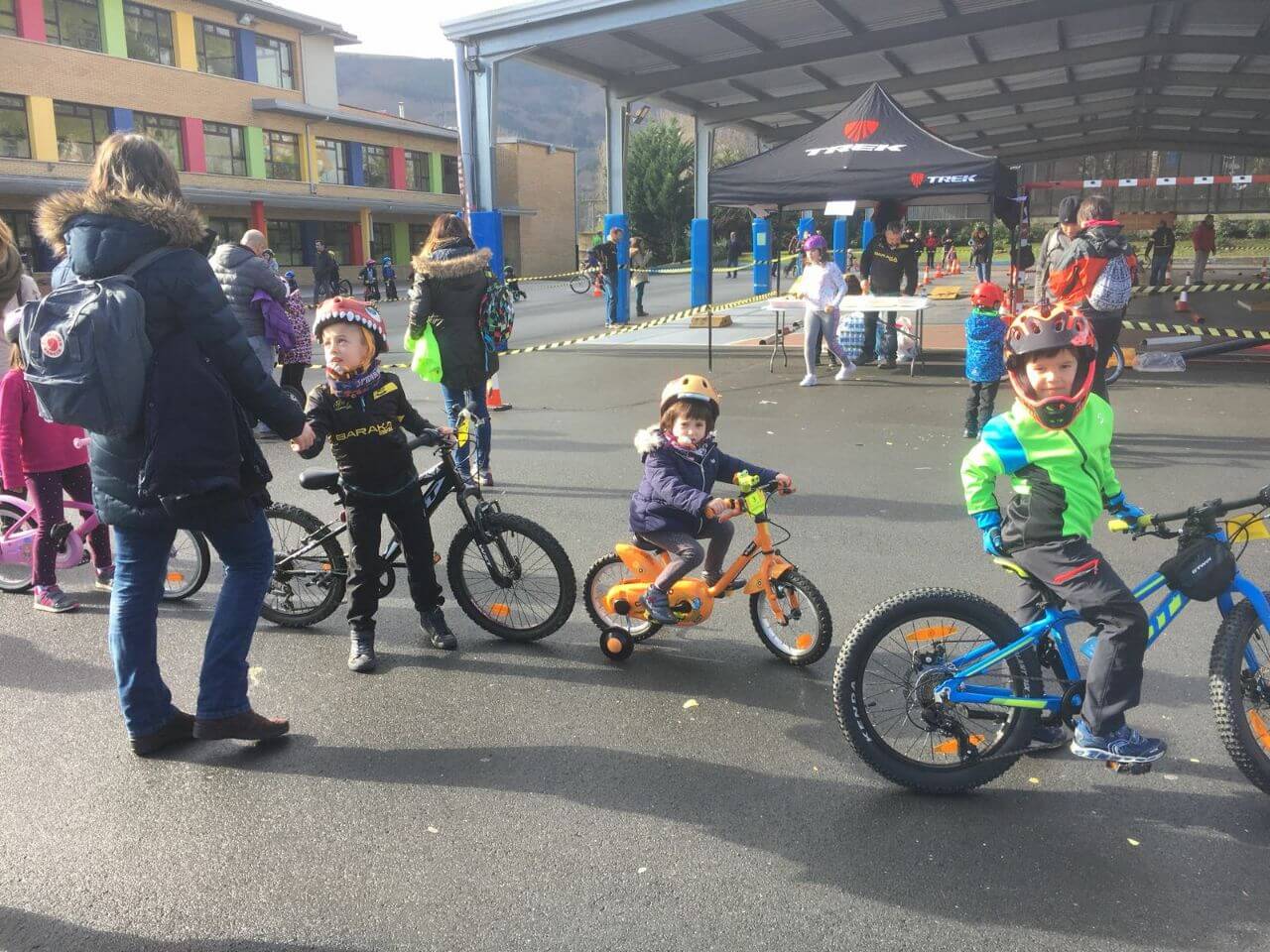 Cuando ya tuvimos todo montado la lluvia había parado, sin embargo el intenso frío persistía y nos temimos lo peor, pero poco a poco empezaron a entrar bicicletas en el recinto de colegio con ñin@s bien abrigad@s, que rápidamente recogían su dorsal y disfrutaban del circuito. Hubo de todo, bicis de BMX, BTT, carretera, con marchas, sin marchas, con cestitas, sin pedales, con ruedines, l@s chaval@s de Hiru Herri con sus bicis de carretera dando brincos y derrapando, los ZuinBikers de Trápaga adornándose con acrobacias, niñ@s con seguridad plena en sus habilidades, l@s que transformaron el miedo en confianza en pocos minutos, l@s más pequeñ@s que necesitaban de ayuda y también hubo alguna lágrima antes de iniciar el recorrido que luego se convertía en sonrisa al acabar el circuito.