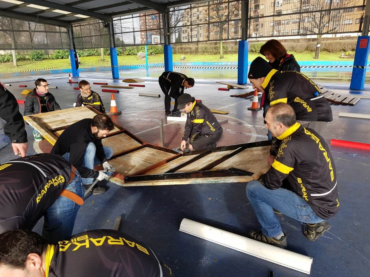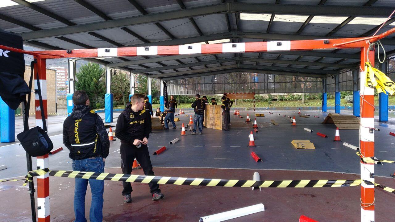 Pronto llegaron las furgonetas con las rampas y obstáculos y acto seguido estábamos manos a la obra diseñando y montando el circuito dentro del aterpe, colocando el arco inflable, las banderolas, las mesas, la música, el avituallamiento, el stand de inscripciones y dorsales. Otr@s fueron a por el agua, comestibles y regalos para el sorteo, todo ello donado por los colaboradores del barrio.